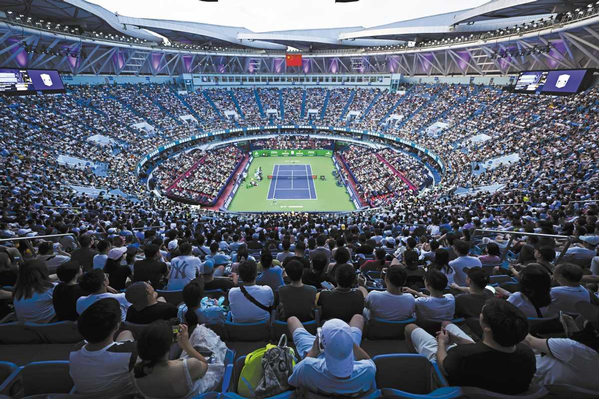 Fans pack the Qizhong Tennis Center's Stadium Court to watch the historic Shanghai Masters final between cousins, and debutant Masters-level finalists, Vacherot and Arthur Rinderknech of France, on Sunday. CHINA NEWS SERVICE