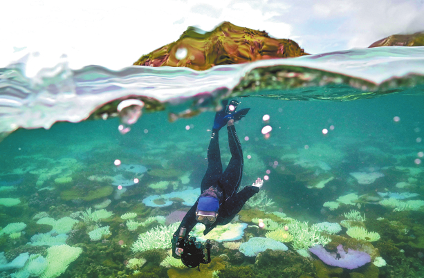 A marine biologist snorkels to inspect and record bleached and dead coral on April 5 around Lizard Island on the Great Barrier Reef, located 270 kilometers north Cairns in Australia. DAVID GRAY/AFP